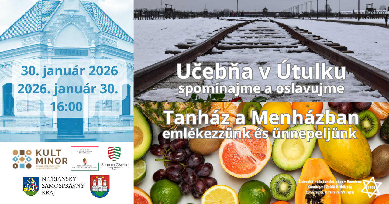 Židovská náboženská obec v Komárne týmto pozýva všetkých záujemcov na piatkový večer pri príležitosti Medzinárodného dňa pamiatky obetí holokaustu OSN a sviatku Tu bi-švat, nového roka stromov, ktorý sa uskutoční v piatok 30. januára 2026 od 16:00 v Menház – Židovskom kultúrnom a komunitnom centre (Ulica Eötvösa 15).
