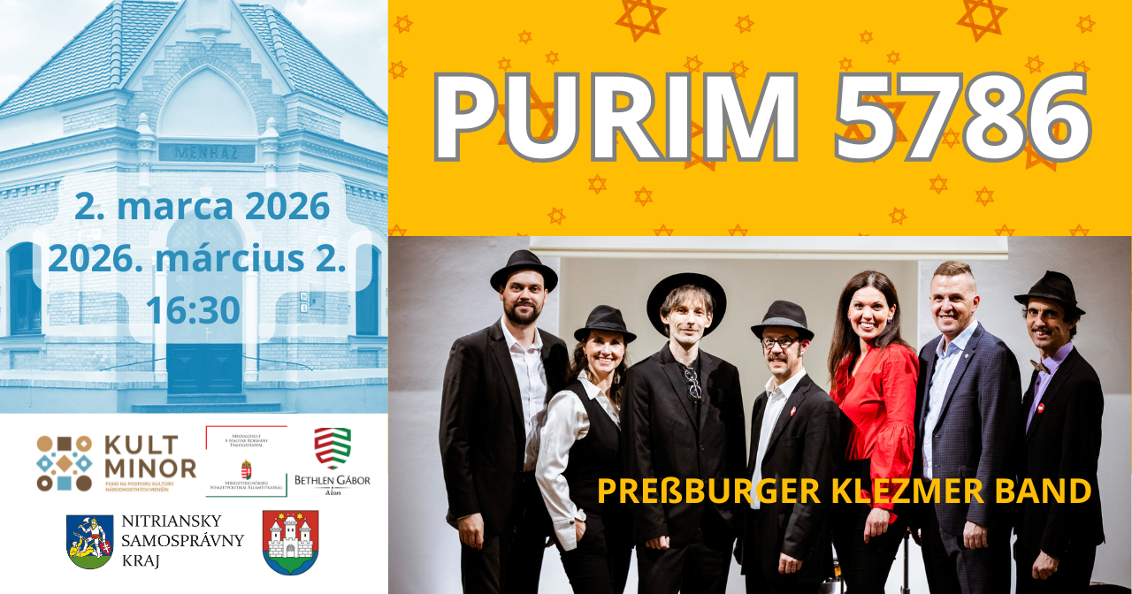 ŽNO Komárno týmto pozýva záujemcov na purimovú oslavu, ktorá sa uskutoční 2. marca 2026, v pondelok o 16:30 v Menháze.