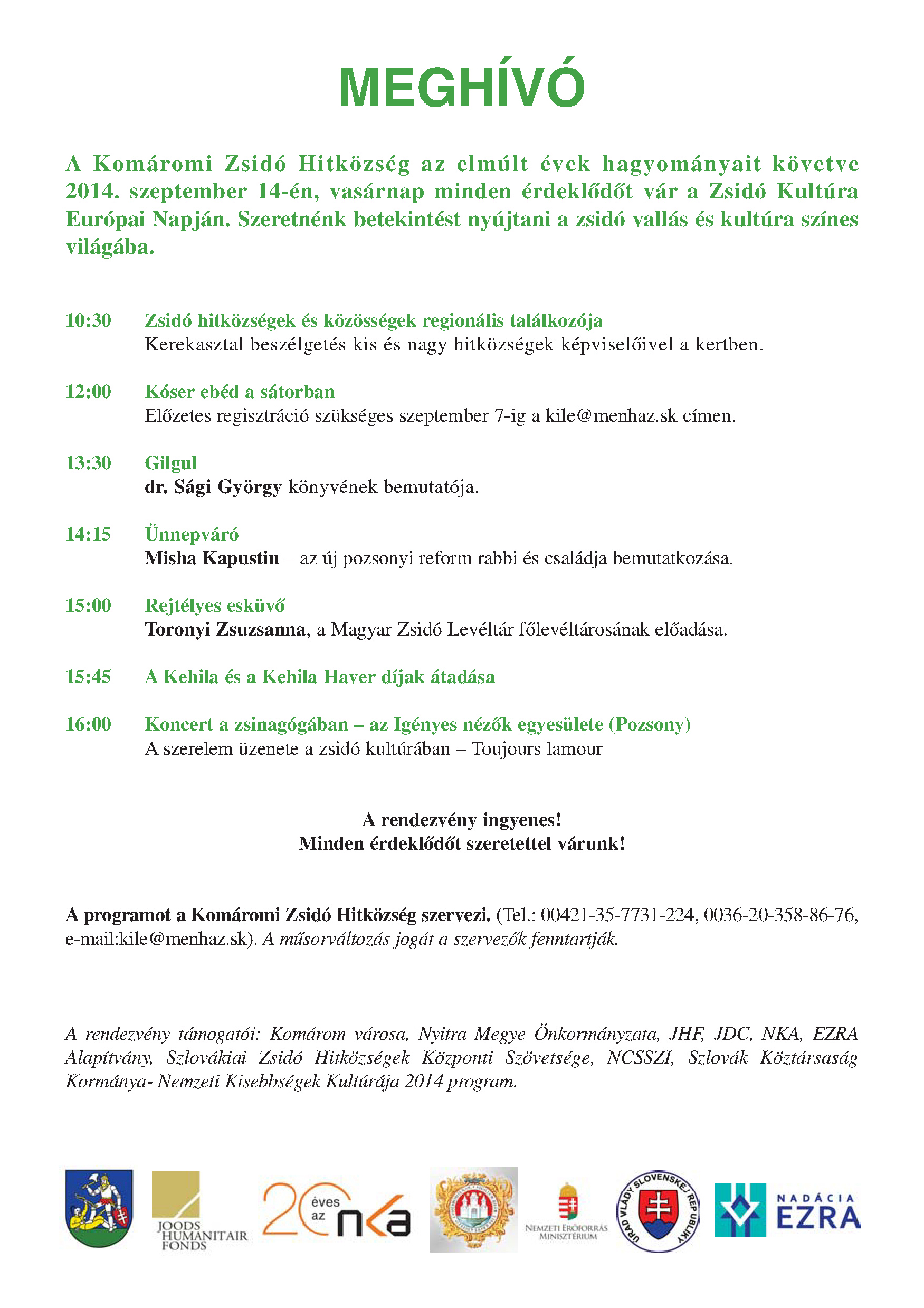 Európsky deň židovskej kultúry – Zsidó Kultúra Európai Napja (miesto konania: Menház, Eötvösova ulica 15. – helyszín: Menház, Eötvös utca 15.)
